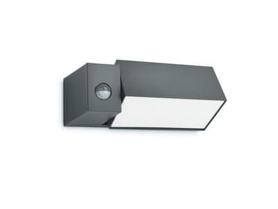 Nástenné hliníkové svietidlo matnej antracitovej farby Border so senzorom, svetelný zdroj E27 1x max. 23W, stupeň krytia IP44, pribalená fluorescenčná žiarovka Philips 23W so svietivosťou 1 430 lm